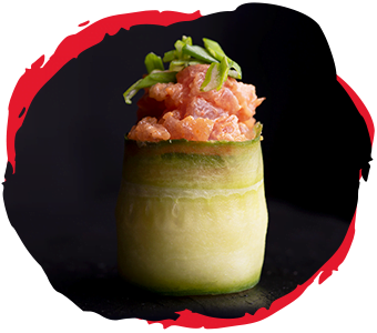 Serek, tatar z tuńczyka, łosoś, ogórek, obtoczone tobiko, majonez, szczypior