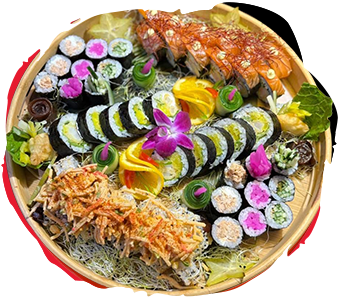 Papier sojowy, ryż, serek, awokado, ogórek, oshinko, węgorz + tatar z łososia opalony, kabayaki, sezam